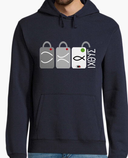 Este diseño está basado en la hipótesis de que éste era el símbolo que usaban en las primeras comunidades para encontrarse entre los cristianos. Uno dibujaba una media luna en el suelo y si el otro dibujaba otra media luna completando el pez, es que era también seguidor de Jesús. Era una especie de «password» con un sentido muy profundo, porque pez en griego (Ichthus) significa I = Iesous (Jesús); Ch = Christos (Cristo); Th = Theou (Dios); U=Uios (Hijo); S=Soter (Salvador). Esta es la lógica del diseño, con tres candados, que solo se abre cuando se mete el «password» correcto.